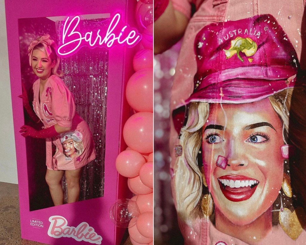 In preparation for the film, I have crafted a wearable piece of art inspired by Margot Robbie portraying Barbie. Utilizing pink denim, I have personally hand-painted and designed various versions of “Aussie Barbie,” such as Koala Barbie, Cork Hat Barbie, and Life Saver Barbie. My intention is to capture the interest of both the renowned actress and the Barbie brand, with the ultimate goal of presenting this unique creation as a gift.